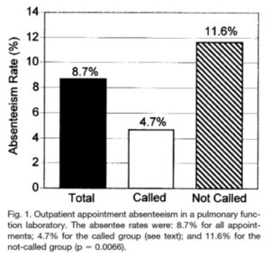 A simple and effective way to reduce absenteeism is to provide patients with an appointment reminder call. Appointment reminder calls have been used in many service industries, including automotive repair, dental care, and beauty salons. Reminder calls have been shown to be effective in PFT labs. In our PFT lab the absentee rate was 11.6% without reminder calls and 4.7% with reminder calls.1 (See Figure 1)