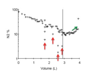 - The dips in nitrogen concentration are most likely due to “deadspace” breaths. These are very small breaths with a very high VD/VT ratio. Since the patient breaths 100% O2 during a nitrogen washout, these small breaths will have a high O2 concentration and a low nitrogen concentration. Once the patient takes normal sized breaths, the nitrogen concentration returns to the expected downward trajectory.