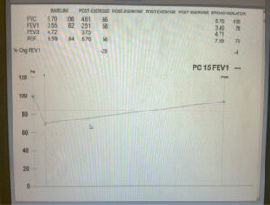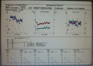 The lower half of the page shows the baseline spirometry vs. repeat spirometry made during different stages of the EVH test. Notice on the first spirometry post EVH, (labeled “dose 1”), spirometry showed a 29% decrease in FEV1 from baseline, also seen as the red expiratory flow/volume loop. This reflects a positive test result and no more post EVH spirometry measurements are necessary. The therapist gave a bronchodilator and the results are reflected in the last flow/volume loop coming back to baseline.