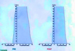 As you may recall from part 1 of this paper, other reactance values can be determined from the reactance curves, such as when the lungs transition from passive distention into active stretching (FRES) and the area under the reactance curve from the reactance at 5 Hertz (X5) to the FRES (AX). Currently, there are no normative sets of reference values for these parameters, although they have been used for trending purposes when gauging a bronchodilator response or response to a therapy plan. Clearly, further research is needed in this area.