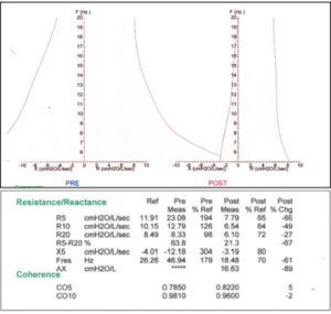 Case 1: A four-year-old boy was taken to the Urgent Care Clinic after his mother noticed that his “regular” nighttime cough had become non-stop. She noted that he frequently complains of being unable to keep up with his friends at school, and after coming down with a cold, has been “making funny sounds” when he breathes. He presented with the following: diffuse wheezing throughout with bilateral crackles at both bases; HR: 162; RR: 32; SpO2: 94%. The patient was speaking in 3-4 word sentences, but indicated that he felt no distress (actually said, “I’m good”.). A peak flow was attempted but that only made the wheezing worse. An astute 2nd year resident, having just completed her pulmonary elective rotation and had an IOS study completed on her, asked if we could see the patient in our clinic. The following is the actual IOS study.