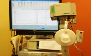 The next step is to start the unit and have the patient go onto the mouthpiece, with either his hands or his parent’s hands supporting his cheeks. Then have him quietly breathe at normal tidal volumes. You should have the child attempt this for 30 seconds, but in my experience I consider myself lucky to get 12 to 15 seconds worth of data.