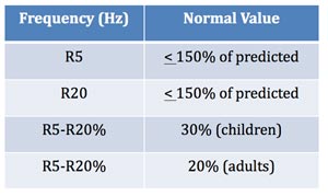 It should be noted the reason for the slight disparity in normal values for the R5-R20 gradient is that healthy, young children (less than seven years of age) have more compliant chest walls and thus exhibit a greater frequency dependence across the frequency spectrum when measuring resistance to air flow.