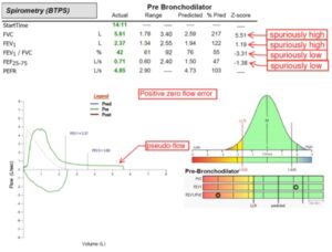 I am an admitted “zero flow” button pusher addict. I am paranoid because flow-sensing pneumotachs are susceptible to both positive and negative flow errors. A positive flow error results in exaggerated expiratory flows and volumes, whereas a negative flow error results in underestimated expiratory flows and volumes. The graphics below show a positive flow error.