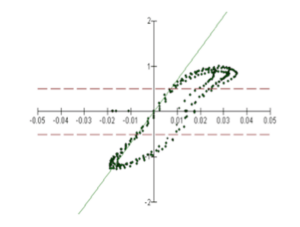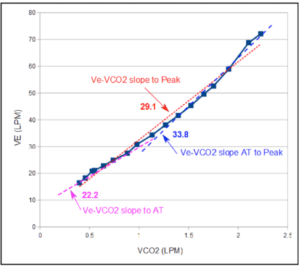 The VE-VCO2 slope, on the other hand, is obtained by linear regression of VE versus VCO2 and is calculated from numerous data points. For this reason, it may be a more reliable measurement than VE/VCO2. There is a different VE-VCO2 slope before and after AT due to lactic acidosis. (See figure 2) Accordingly, the VE-VCO2 slope is usually reported as either the slope from the start of exercise to AT (VE-VCO2AT) or from the start to peak exercise (VE-VCO2Peak).