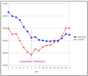 VE/VCO2 is the ratio between VE and VCO2 at any given moment and is usually reported at AT. The same ratio is plotted for VE and VO2. (See figure 1)