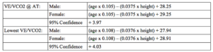 A limitation of this measurement is that it requires an accurate determination of AT. In addition, VE/VCO2 does not usually reach a nadir until sometime after AT. For this reason some investigators have been able to show that the lowest observed VE/VCO2 is probably a better measurement of ventilatory efficiency than the VE/VCO2 at AT. Normal values from Sun, et al. are listed in table 1.