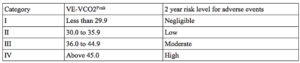 Arena, et al. performed a risk assessment in conjunction with the VE-VCO2Peak slope and have proposed a classification system for patients with cardiac disease. This has been adopted in the most recent European Association for Cardiovascular Prevention/AHA statement on cardiopulmonary exercise testing. (See table 2)