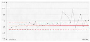 Fig. 3. Levey-Jennings plot of a PO2 electrode prior to and after electrode malfunction. The red solid line represents the true mean of measured values. The dashed red lines represent 2 SD.