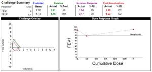 A nine-year-old female underwent a methacholine challenge test because of cough, wheeze, and chest tightness while playing soccer. The result of the methacholine challenge are shown below: