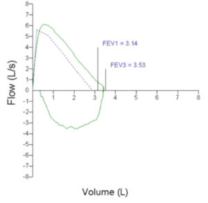 Four years later, the patient once again developed “breathing attacks” during soccer. The patient’s asthma therapy was intensified without any improvement in symptoms. Her symptoms became so limiting that she was forced to quit her soccer team. The patient underwent follow-up spirometry, which was completely normal (see flow-volume loop below):